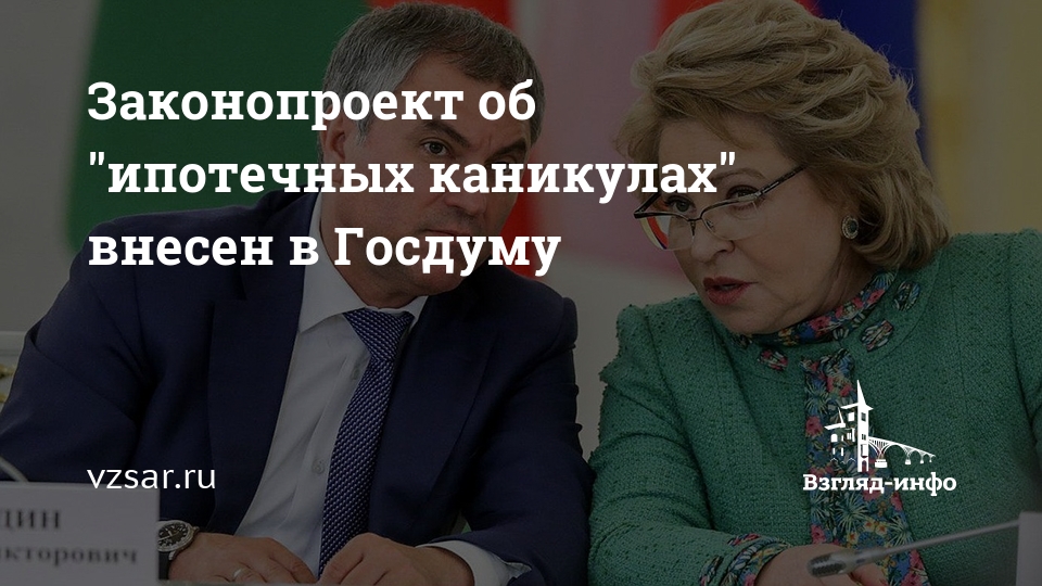 Председатель Госдумы РФ Вячеслав Володин и спикер Совфеда Валентина Матвиенко внесли в ГД законопроект об "ипотечных каникулах". Об этом сообщает пресс-служба нижней палаты Федерального собрания.