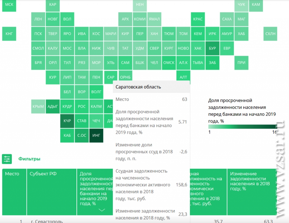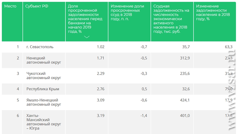 Самый незначительный процент просроченной задолженности у города Севастополя – 1,02%, а самый высокий у республики Ингушетия – 15,89%.