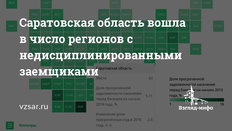 Саратовская область находится на 63 месте в рейтинге регионов по доле просроченной задолженности населения. Как свидетельствуют расчеты "РИА Рейтинг" по данным Центробанка и Росстата, в нашем регионе далеко не самые дисциплинированные заемщики.