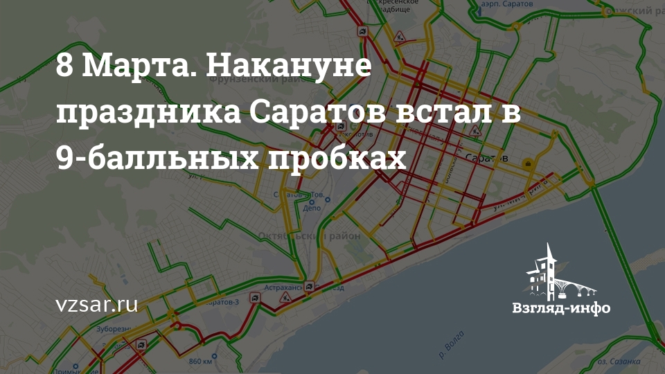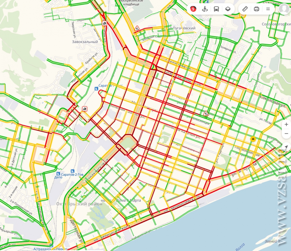 Сегодня предпраздничный короткий рабочий день жители и жительницы Саратова завершают в 9-балльных пробках.