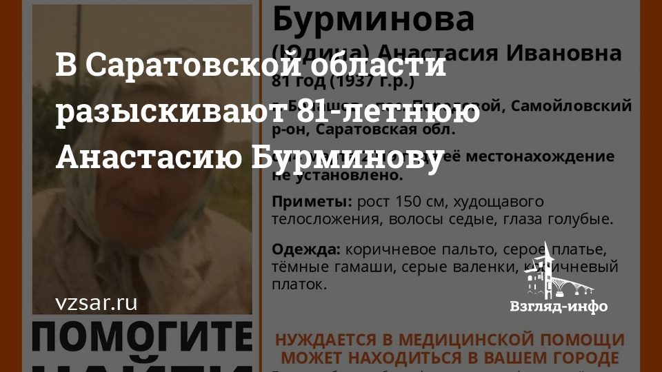 В Саратовской области разыскивают пропавшую без вести 81-летнюю Анастасию Бурминову (Юдину). Об этом сообщает группа "Лиза Алерт Саратов" в соцсети "ВКонтакте".
