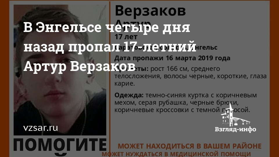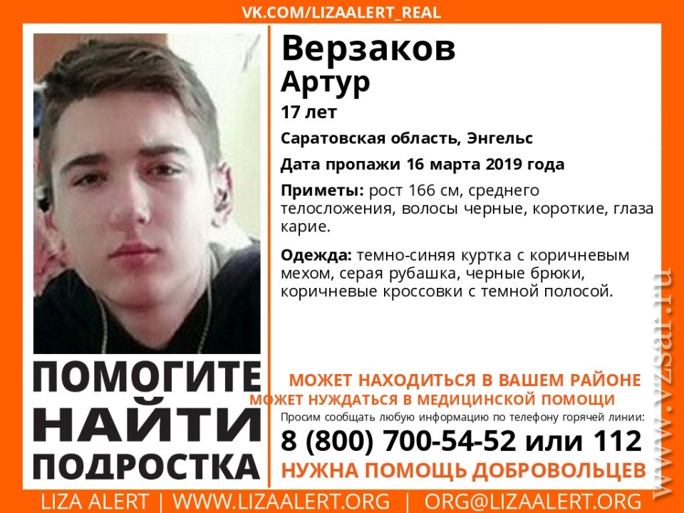 В Энгельсе Саратовской области пропал без вести 17-летний Артур Верзаков. Об этом сообщает группа "Лиза Алерт Саратов" во ВКонтакте.