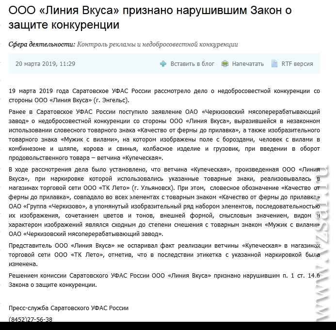 Представитель энгельсского ООО не оспаривал факт торговли ветчиной, отметив, что впоследствии этикетка была изменена. В результате "Линия Вкуса" признана нарушившей п. 1 ст. 14.6 закона о защите конкуренции.