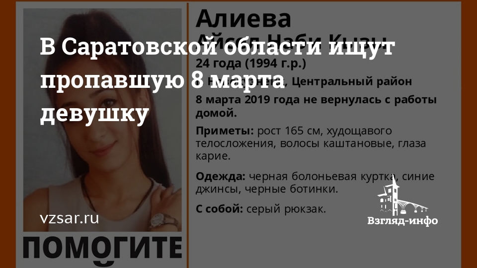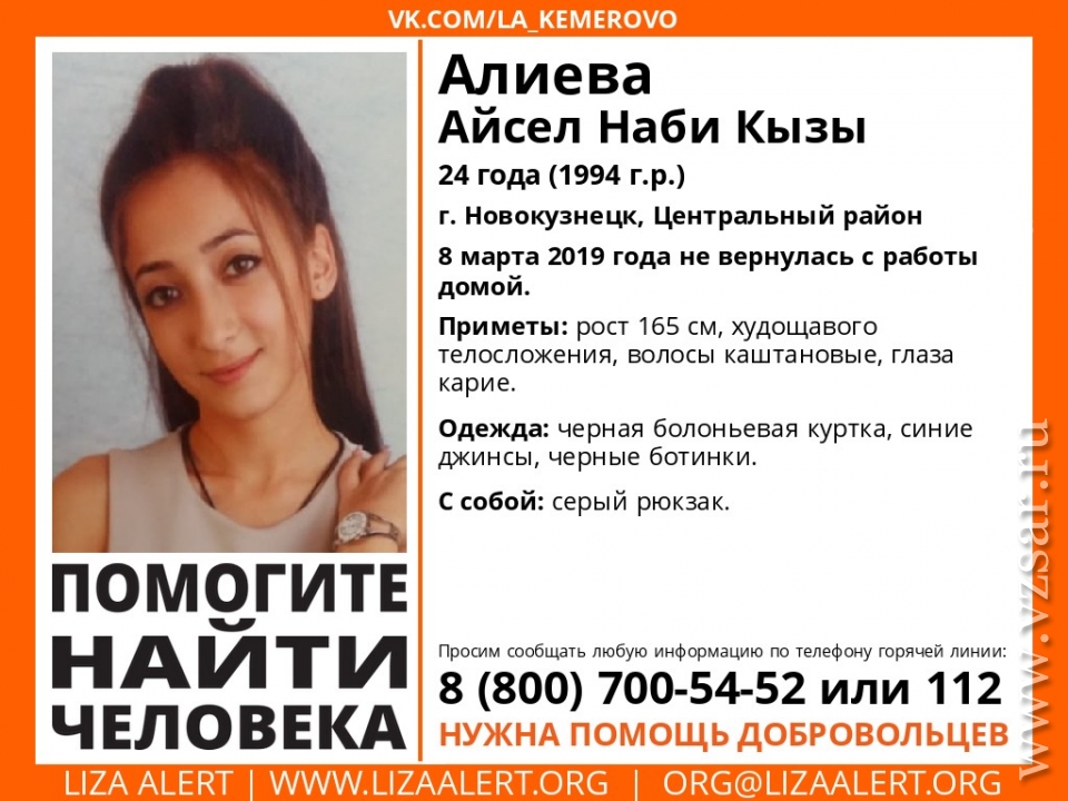 Девушка из Центрального района Новокузнецка 8 марта ушла на работу и больше ее никто не видел. Накануне появилась информация, что Айсел может находиться в Саратовской области.