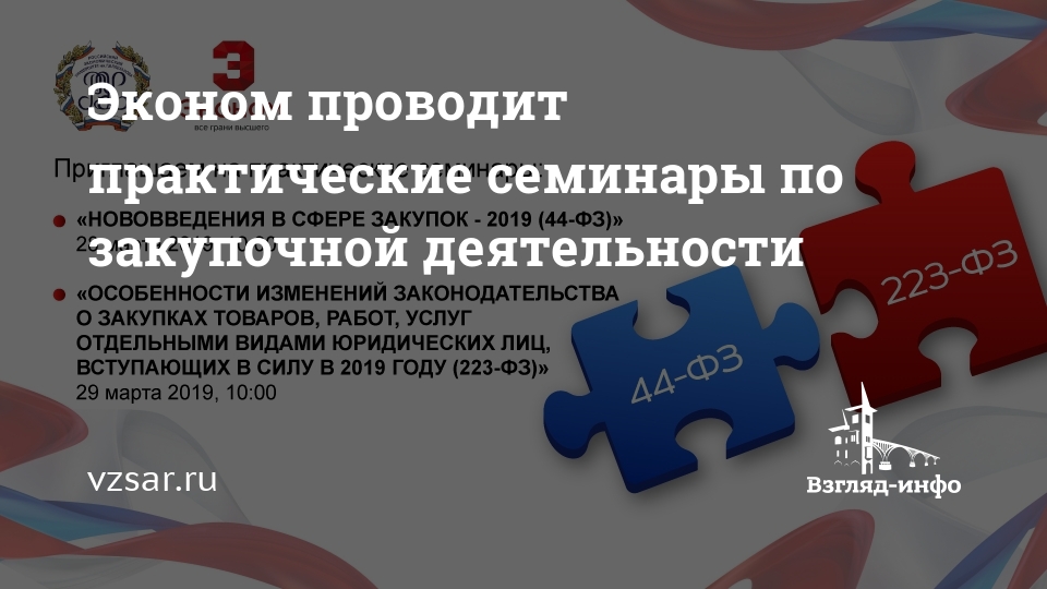 28 и 29 марта 2019 года Саратовский социально-экономический институт РЭУ им. Г.В. Плеханова приглашает всех желающих на практические семинары "Нововведения в сфере закупок – 2019 год"(44-ФЗ) и "Особенности изменений законодательства о закупках товаров, работ, услуг отдельными видами юридических лиц, вступающих в силу в 2019 году" (223-ФЗ), сообщает пресс-служба вуза.