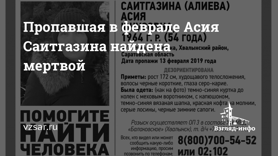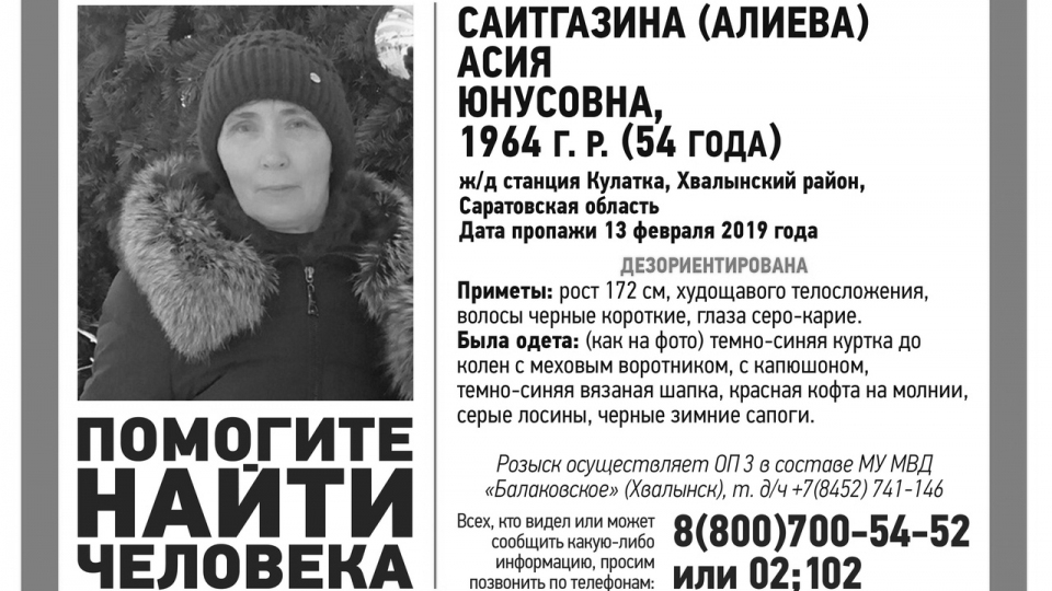 Пропавшая без вести 54-летняя жительница Хвалынска Саратовской области Асия Саитгазина (Алиева) найдена мертвой. Об этом сообщают волонтеры сообщества "Лиза Алерт Саратов" в социальной сети "ВКонтакте".