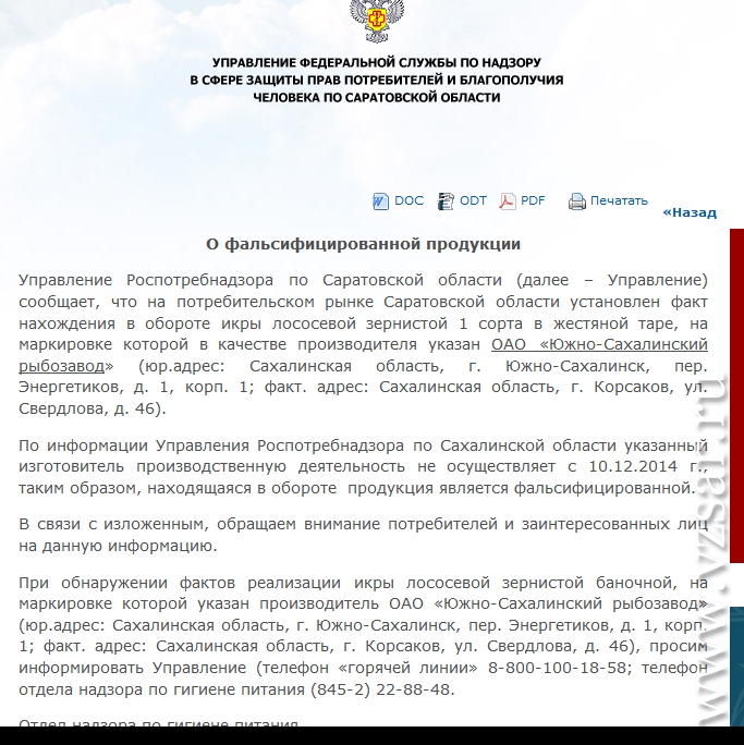 В связи с изложенным надзорное ведомство просит потребителей сообщить по телефону "горячей линии" 8-800-100-18-58 либо в отдел надзора по гигиене питания (845-2) 22-88-48 в случае, если такая икра будет обнаружена.
