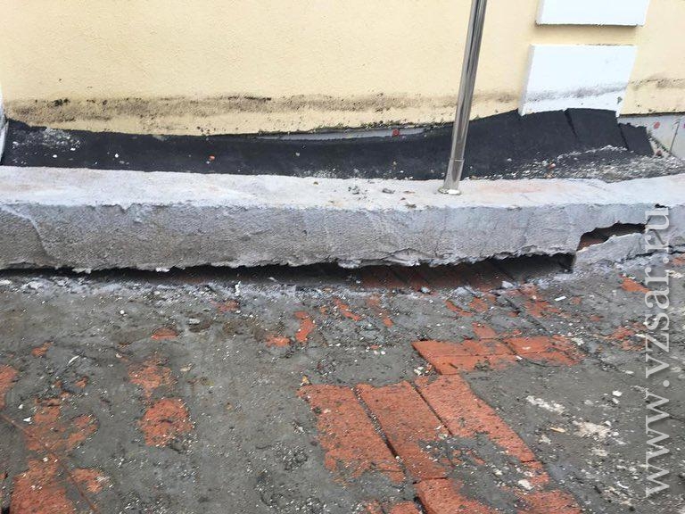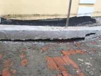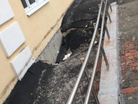 Судя по фотографиям, с приходом весны появились провалы асфальта возле пристройки, есть повреждения и у самого здания: просел пандус, разрушились ступени крыльца.