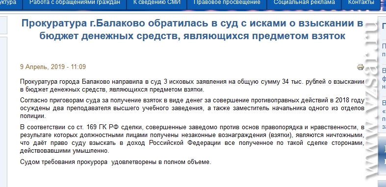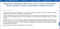 Прокуратура города Балаково Саратовской области направила в суд 3 исковых заявления о взыскании в бюджет денежных средств, являющихся предметом взятки. Об этом сообщает региональная прокуратура.
