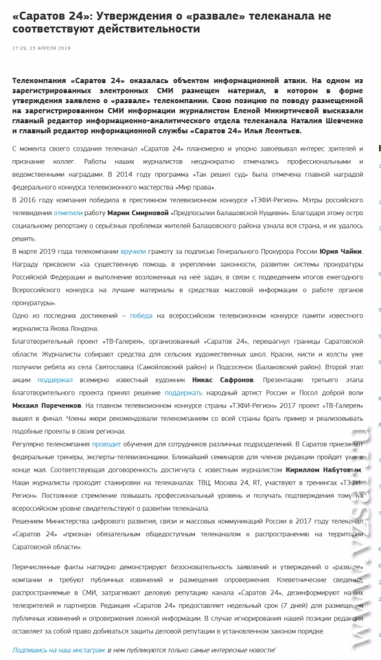 Перечисленные факты наглядно демонстрируют безосновательность заявлений и утверждений о "развале" компании и требуют публичных извинений и размещения опровержения. Клеветнические сведения, распространяемые в СМИ, затрагивают деловую репутацию канала "Саратов 24", дезинформируют наших телезрителей и партнеров.