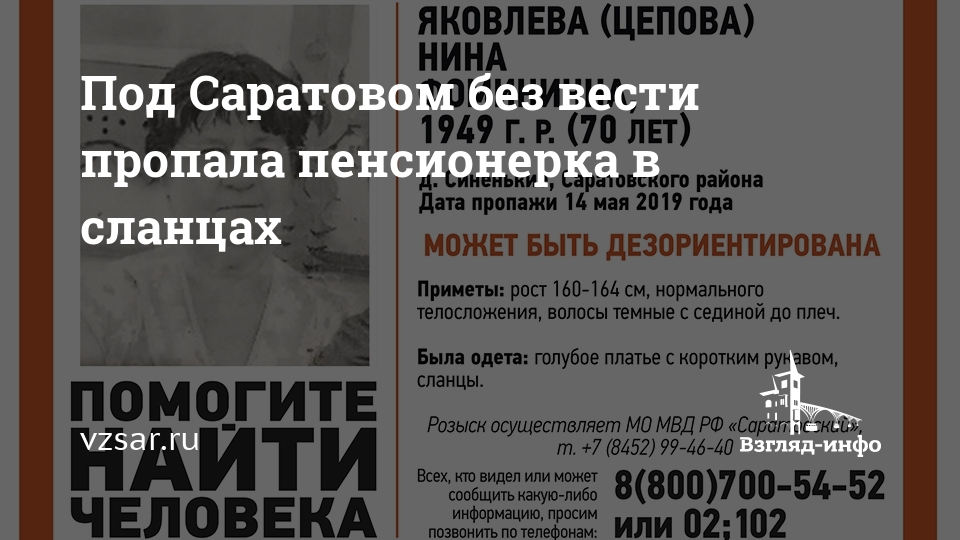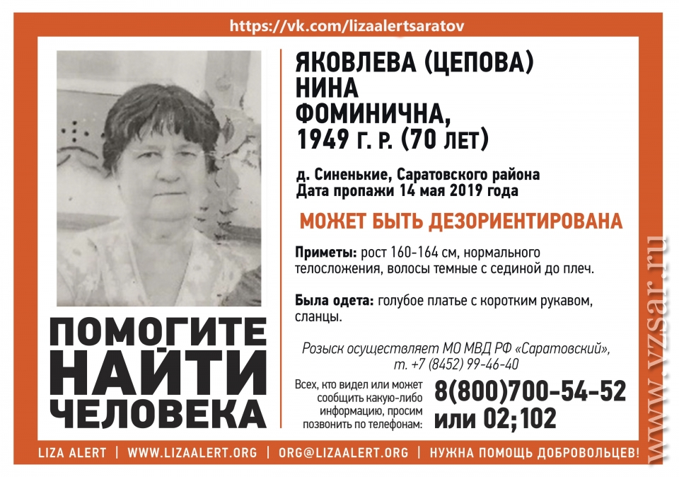 Граждане, кому что-либо известно о местонахождении пропавшей, могут позвонить по телефону: +7(8452) 99-46-40, 8(800)700-54-52 или 02; 102.