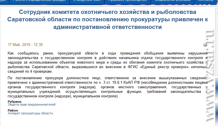 Напомним, ранее зампред комитета охотничьего хозяйства и рыболовства Саратовской области Александр Серебряков был привлечен к ответственности за отсутствие в интернете информации о результатах проверок. Чиновнику назначили наказание в виде штрафа в размере 3 000 рублей.