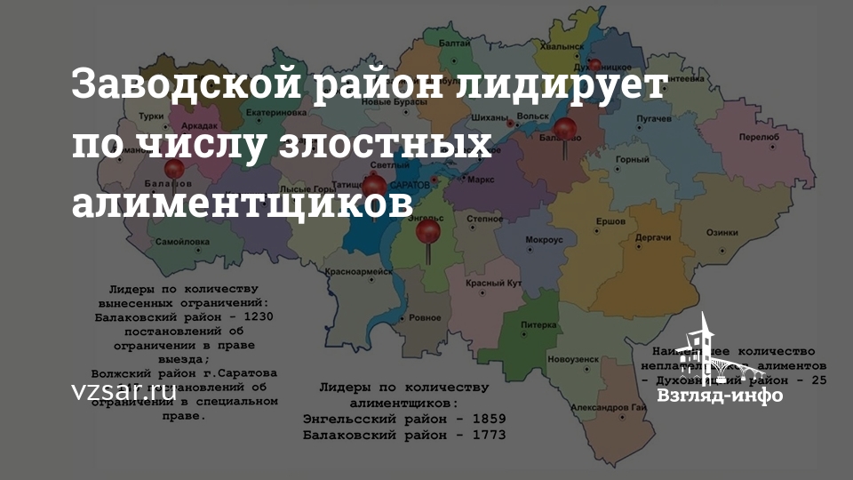 Лидерами среди районов области по числу алиментообязанных граждан стали Энгельсский и Балаковский районы. В них проживают 1859 и 1773 должников соответственно, игнорирующих обязательства по выплате средств на содержание детей. Наименьшее число неплательщиков по алиментам зарегистрировано в Духовницком районе – всего 25.