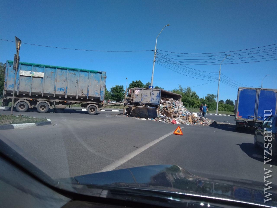 Сегодня утром в Саратове на кольце возле строительного рынка при въезде в Юбилейный перевернулся мусоровоз. Фото с места ДТП публикует телеграм-канал Пар ослов.