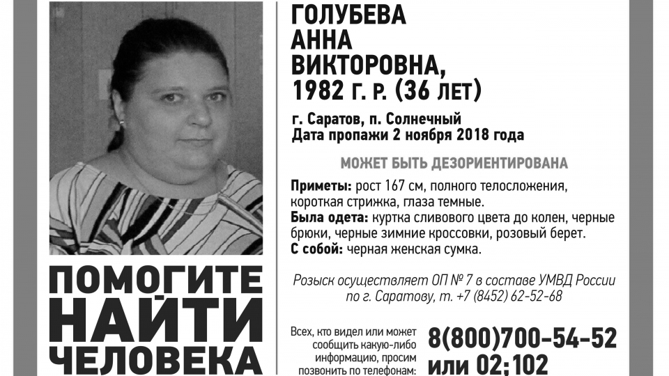 В Саратове найдена погибшей Анна Голубева, пропавшая в начале ноября прошлого года. Об этом сообщают волонтеры сообщества "Лиза Алерт Саратов" в социальной сети "ВКонтакте".