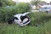 Автор ролика разворачивается и начинает преследование виновника аварии. Однако вскоре тот вылетает с проезжей части в кювет. Из автомобиля врассыпную разбегаются молодые люди.