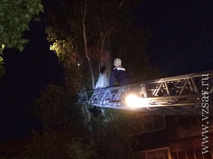 По данным ведомства, в 2.00 специалистам балаковской ПСС пришлось выезжать к дому № 116"Б" по улице Чапаева. Как сообщили очевидцы, на высоте пятого этажа на тополе застрял местный житель, который решил достать котенка, однако спуститься не смог.