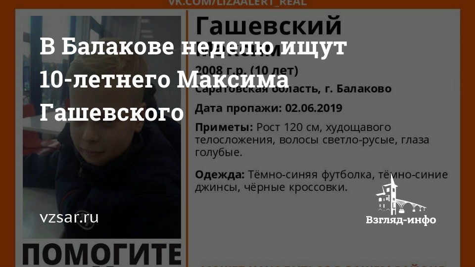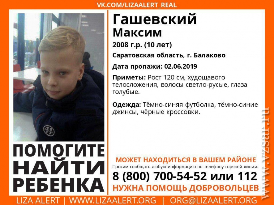В Балакове Саратовской области ищут пропавшего без вести 10-летнего Максима Гашевского. Об этом сообщает поисковый отряд "Лиза Алерт Саратов".