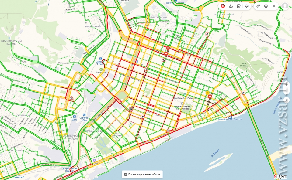 Сегодняшний вечер накануне выходного дня жители Саратова проводят в серьезных заторах. Сервис "Яндекс.Пробки" оценивает ситуацию на 8 баллов.