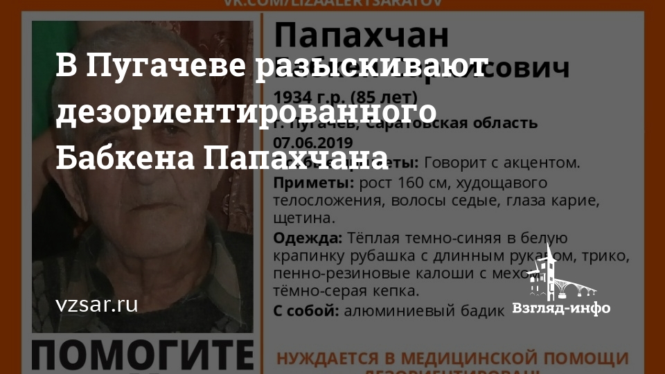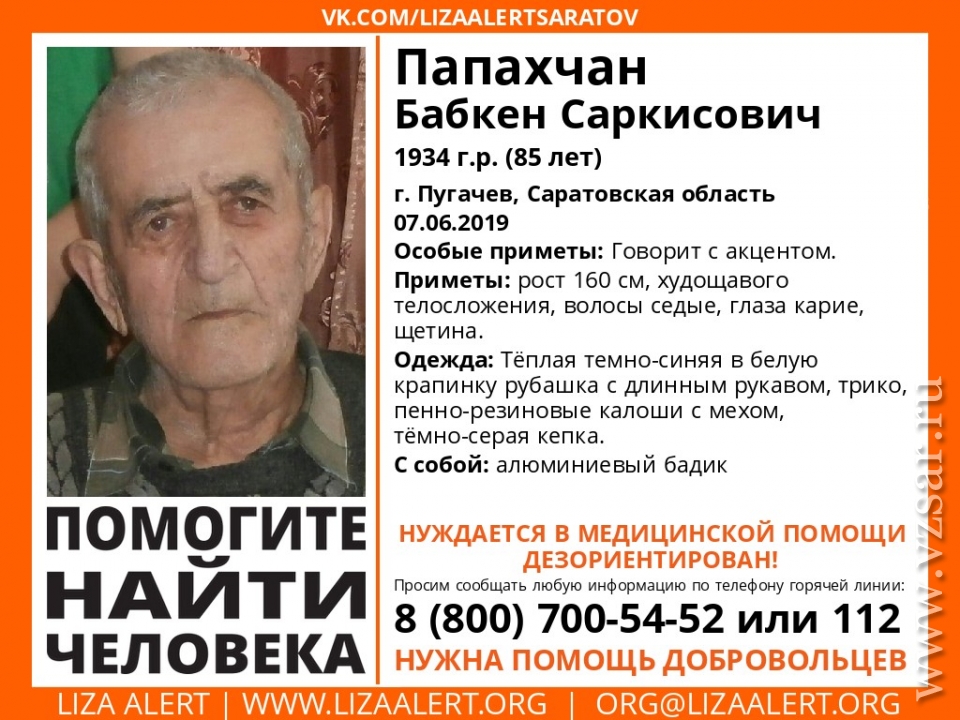 В Пугачеве Саратовской области с 7 июня не могут найти пропавшего 85-летнего Бабкена Папахчана. Об этом сообщают волонтеры сообщества "Лиза Алерт Саратов" в соцсети "ВКонтакте".