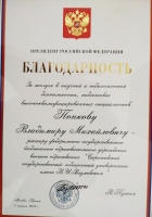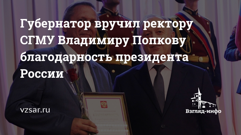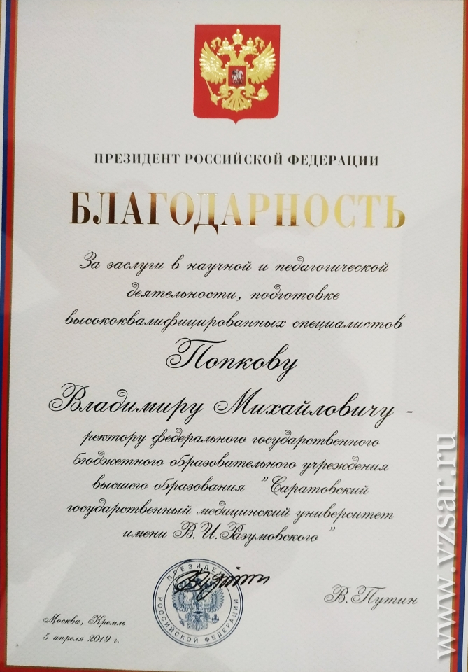 Ректор Саратовского государственного медицинского университета имени Разумовского, заслуженный врач РФ, профессор Владимир Попков был отмечен благодарностью президента Российской Федерации Владимира Путина за заслуги в научной и педагогической деятельности, подготовке высококвалифицированных специалистов.