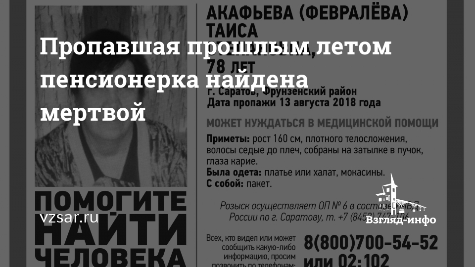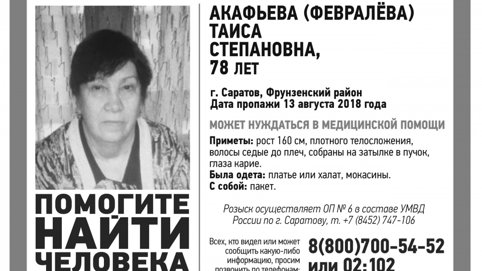 Пропавшая в августе прошлого года во Фрунзенском районе Саратова 78-летняя Таиса Акафьева найдена мертвой. Об этом сообщают волонтеры сообщества "Лиза Алерт Саратов" в социальной сети "ВКонтакте".
