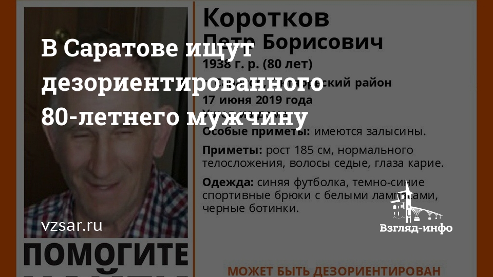 Приметы: рост 185 см, нормального телосложения, волосы седые, глаза карие. В день пропажи был одет в синюю футболку, темно-синие спортивные брюки с белыми лампасами и обут в чёрные ботинки.