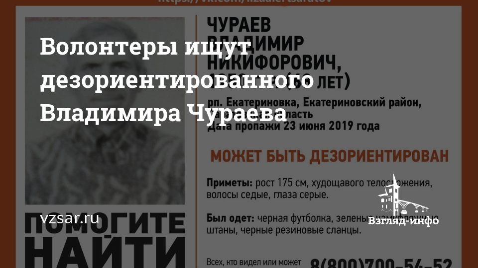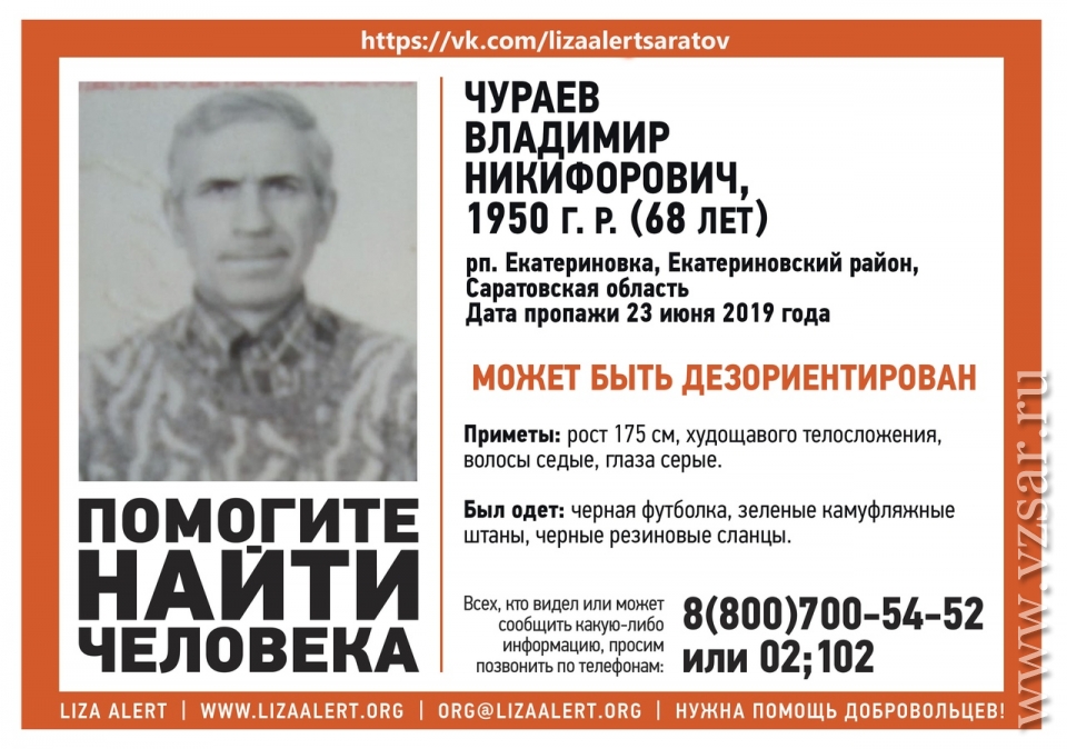 Его приметы: рост 175 см, худощавого телосложения, седые волосы, серые глаза. На момент пропажи был одет в черную футболку, зеленые камуфляжные штаны, черные резиновые сланцы.