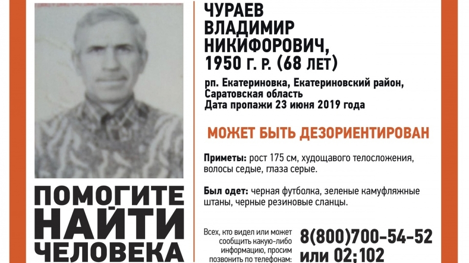 Пропавший без вести в рабочем поселке Екатериновка Саратовской области Владимир Чураев найден живым. Об этом сообщают волонтеры поискового сообщества "Лиза Алерт Саратов".