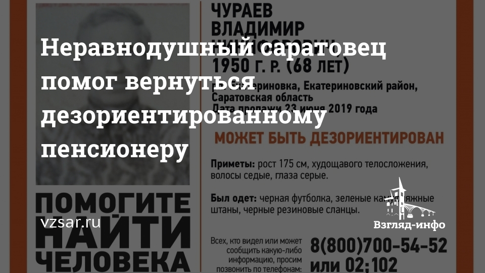"Найден, жив Чураев Владимир Никифорович. Отдельное спасибо неравнодушному местному жителю, который нашел дедушку и привез его домой", - пишут волонтеры.