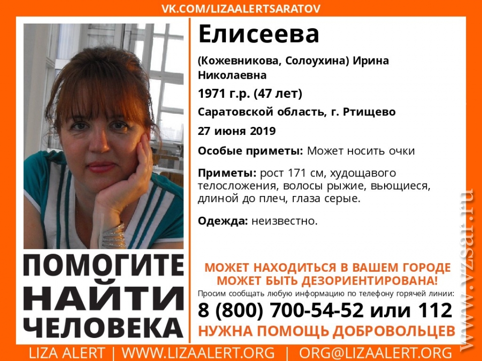 Всех, кому что-либо известно местонахождении Ирины Елисеевой, просят позвонить по телефонам 8(800)700-54-52 или 112.
