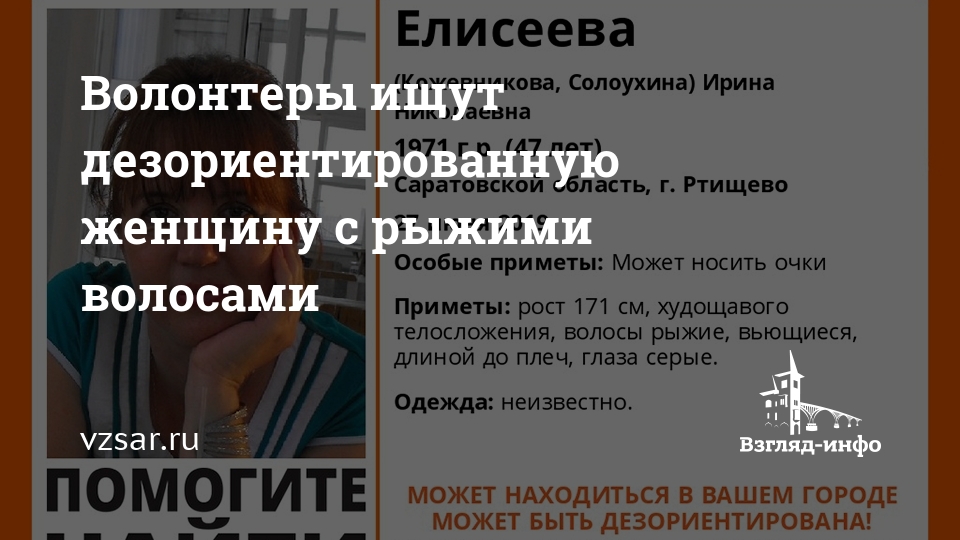 Ее приметы: рост 171 см, худощавого телосложения, вьющиеся рыжие волосы длиной до плеч, серые глаза. Может носить очки.