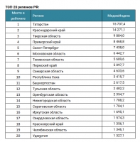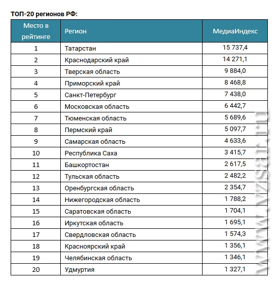 Лидерами медиарейтинга стали Татарстан (15 737,4) и Краснодарский край (14 271,1).