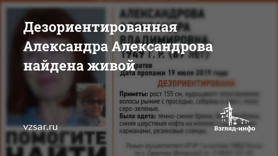 Пропавшая без вести в Саратове 69-летняя Александра Александрова найдена живой. Об этом сообщают волонтеры поискового отряда "Лиза Алерт Саратов".