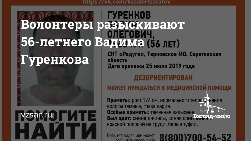 В Саратовской области пропал без вести 56-летний Вадим Гуренков. Об этом сообщают волонтеры сообщества "Лиза Алерт Саратов" в соцсети "ВКонтакте".