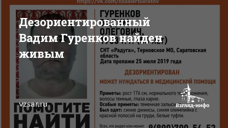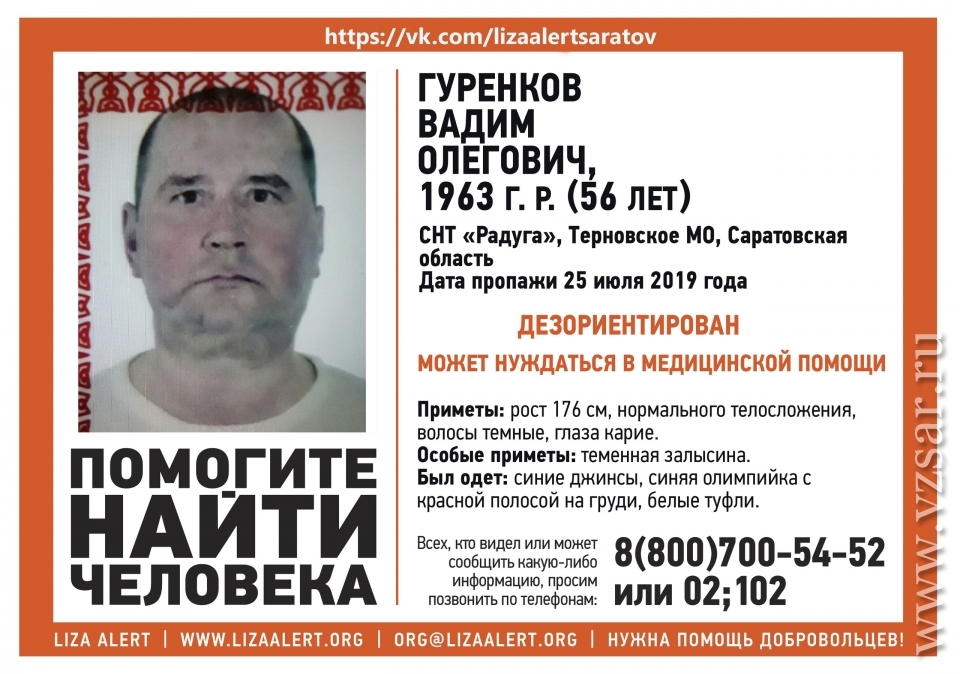Пропавший в Саратовской области 56-летний Вадим Гуренков найден живым. Сегодня вечером об этом сообщил поисковый отряд "Лиза Алерт Саратов".