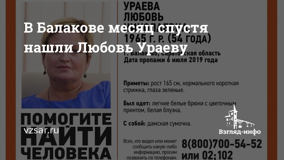 В Балакове Саратовской области найдена пропавшая около месяца назад 54-летняя Любовь Ураева. Об этом сообщает поисковый отряд "Лиза Алерт Саратов".