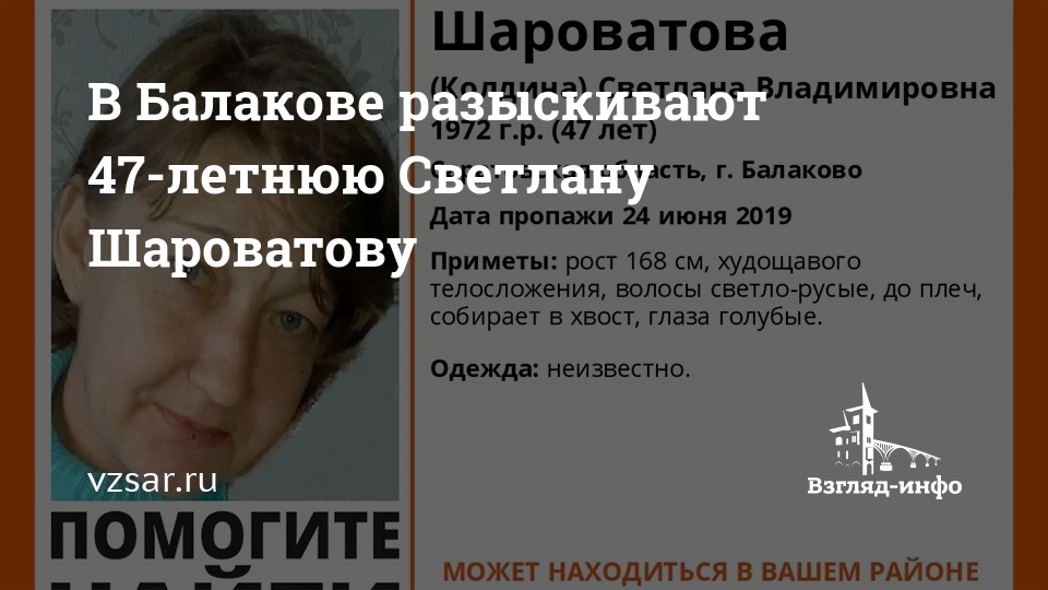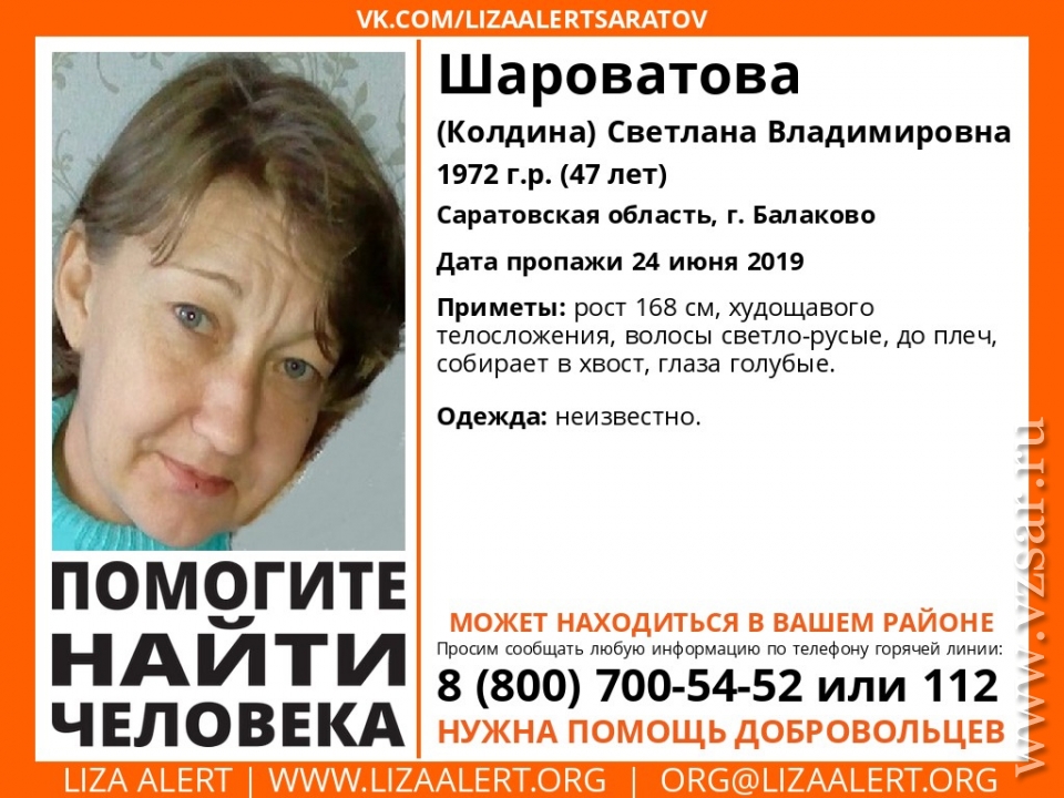 В Балакове Саратовской области пропала без вести 47-летняя Светлана Шароватова (Колдина). Местонахождение женщины неизвестно с 24 июня, сообщают волонтеры поискового сообщества "Лиза Алерт Саратов".