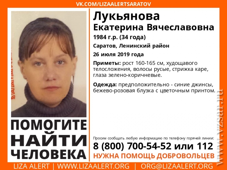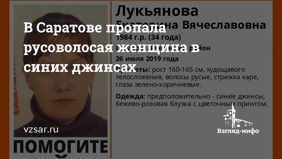 Приметы: рост 160-165 см, худощавого телосложения, волосы русые, стрижка каре, глаза зелено-коричневые. В день пропажи предположительно была одета в синие джинсы, бежево-розовую блузку с цветочным принтом.