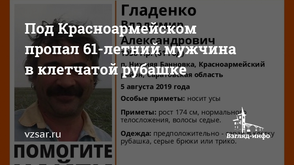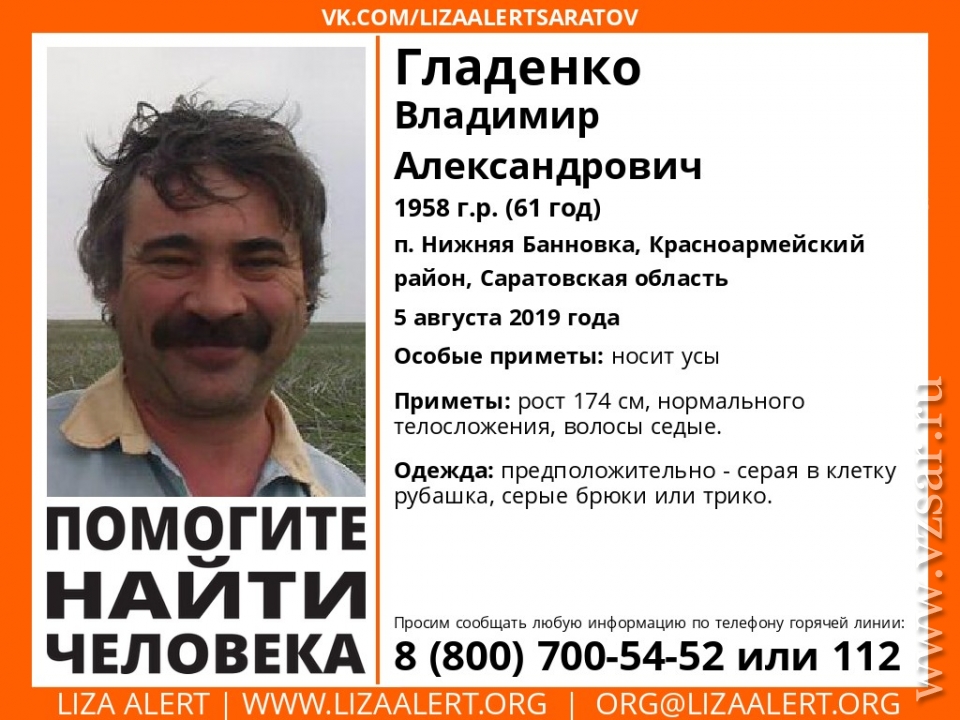 В поселке Нижняя Банновка Красноармейского района пропал 61-летний Владимир Гладенко. О его местонахождении ничего не известно с 5 августа, сообщают волонтеры сообщества "Лиза Алерт Саратов".
