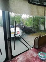 Как видно на фото из соцсетей, от удара внедорожник перевернулся и "прилег" машине такси "Метро" на капот.
