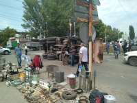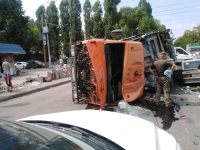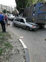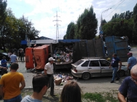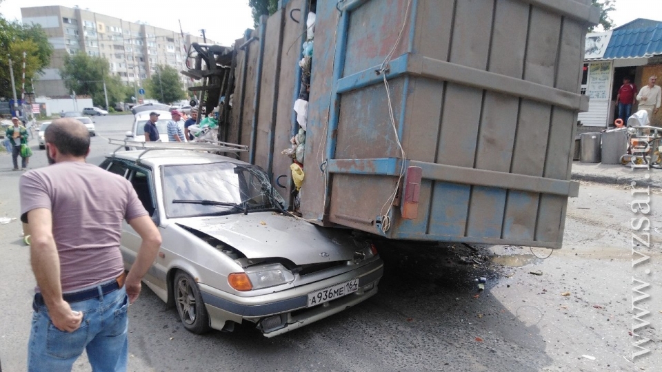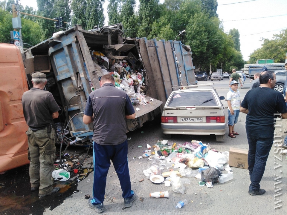 По предварительным данным, при проезде перекрестка мусоровоз врезался в ВАЗ-2114, после чего опрокинулся, повредив "четырнадцатую" и "Фольксваген Тигуан".