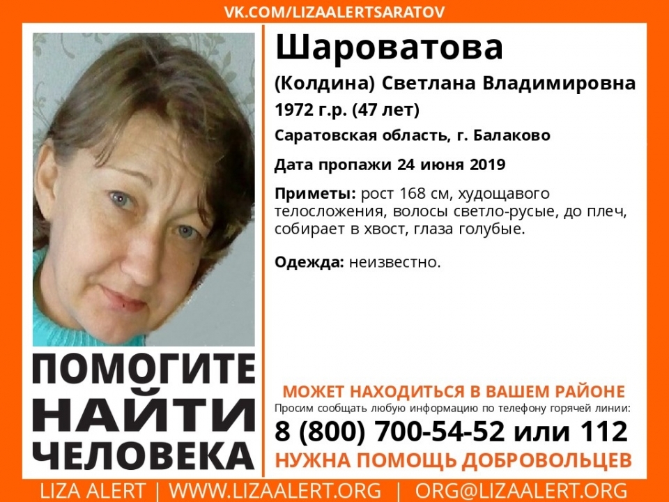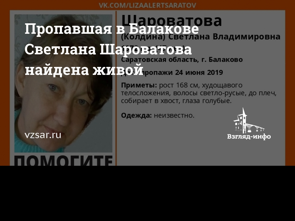 В Балакове Саратовской области найдена живой 47-летняя Светлана Шароватова (Колдина). Об этом сообщают волонтеры сообщества "Лиза Алерт" в социальной сети "ВКонтакте".