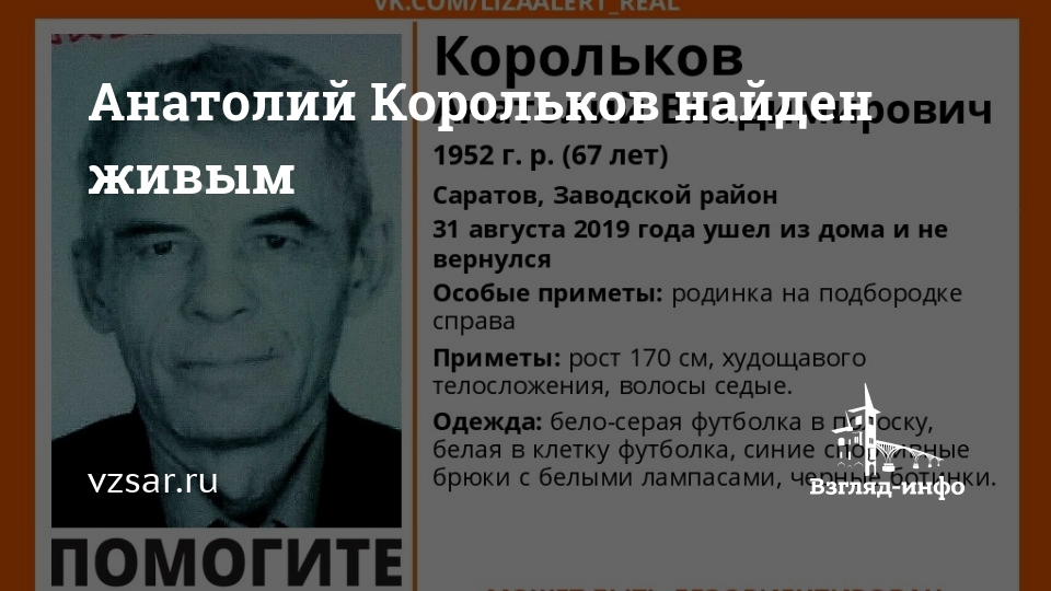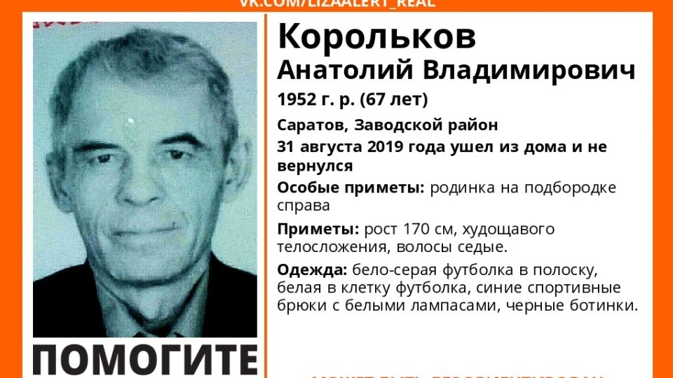 Пропавший вчера в Заводском районе Саратова 67-летний Анатолий Корольков найден живым. Об этом сообщают волонтеры сообщества "Лиза Алерт Саратов" в соцсети "ВКонтакте".