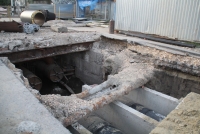По пути ко второй точке, участники рейда заметили провалы в асфальте у недостроя "Биос". Глава минстроя предположил, что асфальт рухнул на месте старой ливневки, и попытался узнать, кому принадлежит данный участок. Однако представители "Т Плюс" и ООО "КВС" открестились от него.