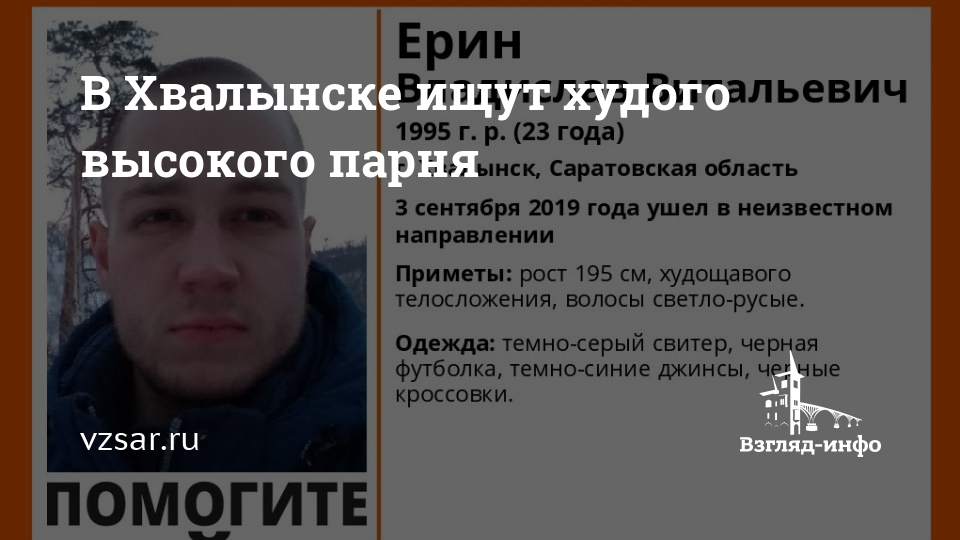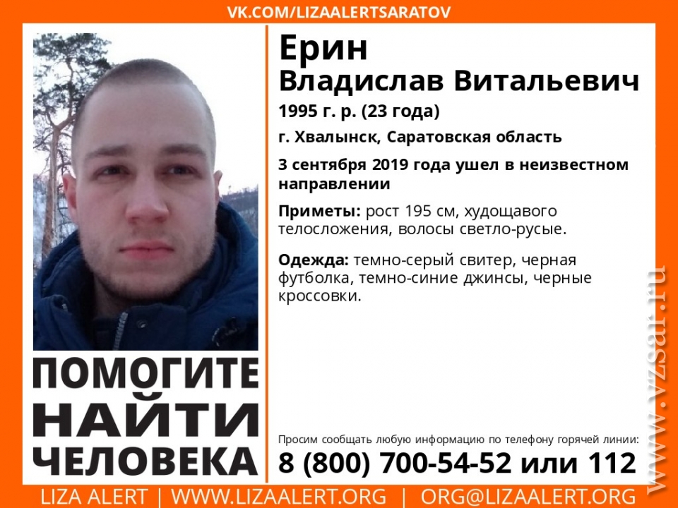 В Хвалынске пропал без вести 23-летний Владислав Ерин. Об этом сообщают волонтеры сообщества "Лиза Алерт Саратов".