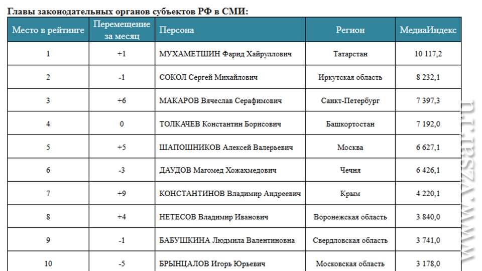 Самым медийным в августе стал председатель госсовета Татарстана Фарид Мухаметшин, а последнее, 85-е место, занимает Владимир Павлов – председатель Народного Хурала Республики Бурятия.