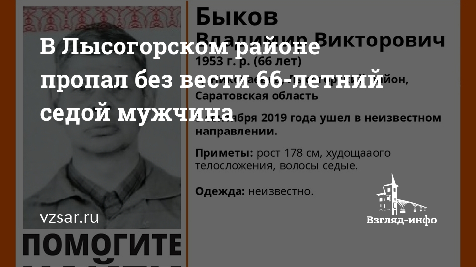 В Лысогороском районе Саратовской области пропал без вести 66-летний Владимир Быков. Об этом сообщают волонтеры "Лиза Алерт Саратов" в социальной сети "ВКонтакте".