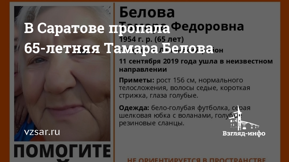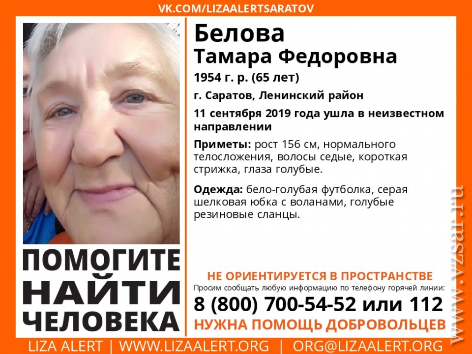 В Ленинском районе Саратова пропала без вести 65-летняя Тамара Белова. Об этом сообщают волонтеры "Лиза Алерт Саратов" в соцсети "ВКонтакте".