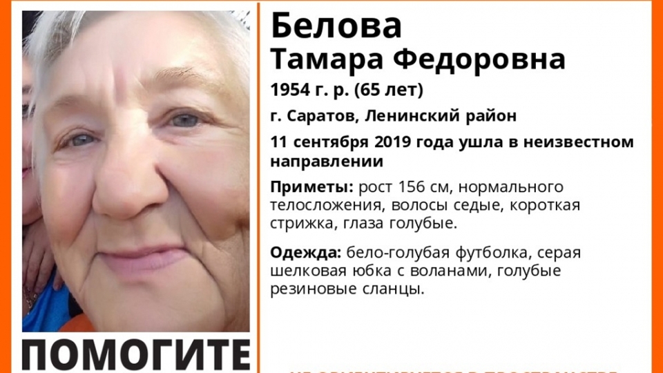 В Саратове найдена пропавшая 65-летняя Тамара Белова. Об этом сообщает поисковый отряд "Лиза Алерт Саратов".